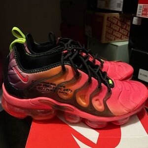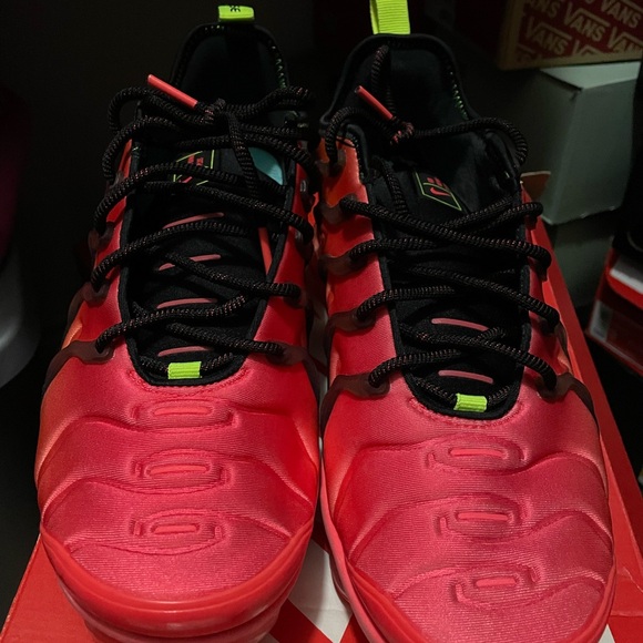 Sleek Nike Air VaporMax Plus. Bold black with striking crimson accents. Ideal for athletic and casual wear.