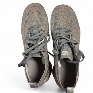 Super comfortable, supportive, and breathable. Lots of stretch and give for comfort. Grey with silver accents and clear bubbles. These shoes are part of the revolutionary Nike Air VaporMax line, known for their unique design and cushioning technology. Designed for running, but popular lifestyle shoe.