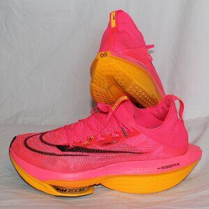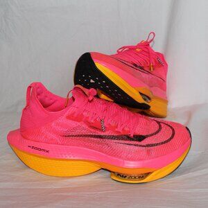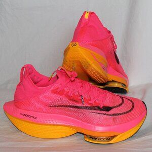 Nike AIR ZOOM Alphafly Next% 2 Hyper Pink Laser Orange Atom Knit Running Shoes Men’s Size 12.5. Design for comfort and performance, offer a snug fit with a stretchy, durable and breathable upper material. Known for their Air Zoom technology, which provides optimal cushioning and responsiveness. Preloved but plenty of miles left on these shoes - soles pictured. Upper material and laces are in excellent condition - pictured from all angles. Will ship in original box with as shown with Nike drawstring bag pictured. Note small hole in box side and written "1" on lid - pictured.