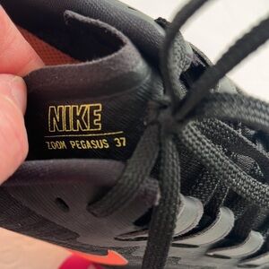 Nike Air Zoom Pegasus 37 black neon orange running sneakers. Brand new never worn - only one was even tried on. I bought these for my son ahead of time and now they don’t fit. Essential classic style in one of their best versions. Smoke free home