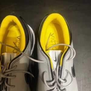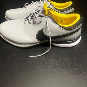 Shoes are out the box, but have never been worn. The color scheme is light smoke gray and black. Shoes are in excellent condition.