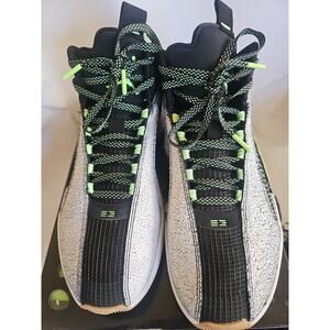 The Nike Air Jordan XXXV 35 SP-Z Bayou Boys sneakers feature a lace-up closure, high-top shoe height, and a medium (D, M) shoe width. With a solid white, black, and green color scheme and a pattern celebrating the Bayou Boys theme, these athletic shoes are designed for basketball performance and casual styling. The sneakers showcase the iconic Air Jordan 35 model, paying tribute to basketball superstar Zion Williamson. Made with synthetic upper material and originating from China, these sneakers are a stylish and comfortable choice for men's footwear.
