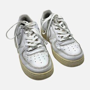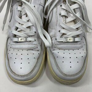 A preowned pair of classic Nike Airforce 1 lace up platform sneakers in youth size 7, the equivalent of women's size 8.5. Uppers are white leather with perforations at the toes. Insole is cushioned. Outsole is a 1" platform of rubber. Good preowned condition, these sneakers have been cleaned inside and out, some light wear and marks remain. Priced accordingly.