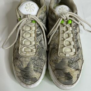 Nike Airmax training shoes. I haven't seen any others in this colorway before so they are unique. Featuring classic ‘90s style, and airy mesh it lets you celebrate your style in comfort. They have just do it and historical Nike symbolism on the pattern. The top is iridescent. They have been well-loved so there is some slight discoloration. These shoes are so unique when worn and I always got compliments on them. Great for training, running or even everyday wear. SAME DAY SHIPPING