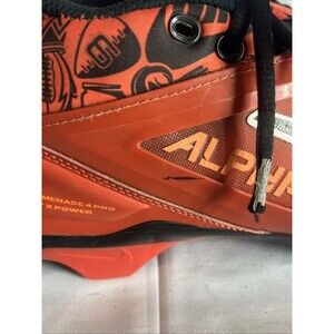The Nike Alpha Menace 4 Pro Picante Red Black Football Cleats are a stylish and functional pair of athletic shoes designed for football players. Featuring a solid orange color with black accents and a Cincinnati Bengals character, these lace-up cleats are customized with a colorful theme. Made with synthetic upper material and plastic cleats, they provide comfort and durability for optimal performance on the football field. With a standard shoe width and a size 8 fit, these Nike Alpha Menace cleats are a must-have for any football enthusiast looking to stand out on the field.
