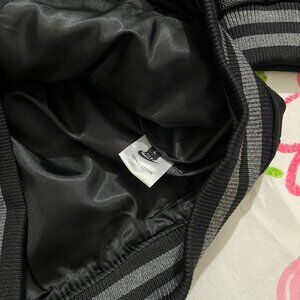 Gray striped ribbing at the collar, cuffs, and hem