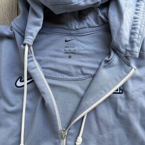 Stylish blue hoodie with zip-up front. Features Nike logo and emblem. Ideal for everyday wear.