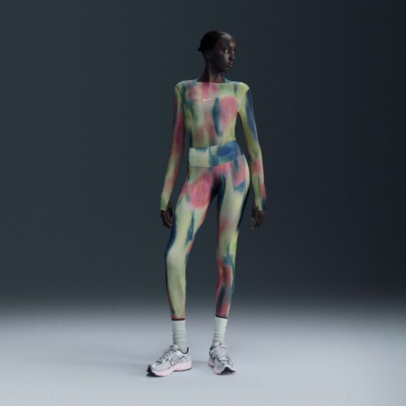 Stretchy, sweat-wicking fabric splashed in painterly colors keeps you moving comfortably all day in leggings crafted with a higher waist and a hidden back pocket for holding small essentials. 25" inseam; 8" leg opening; 10 1/2" front rise; 13 1/2" back rise (size Medium) Elastic waist Back interior drop-in pocket Dri-FIT moisture-wicking technology 80% polyester, 20% spandex Machine wash, tumble dry Imported