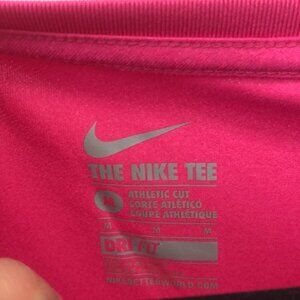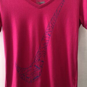 Nike Athletic Cut V Neck Top Size Medium. Bright pink top with a blue swoosh design. In very good used condition