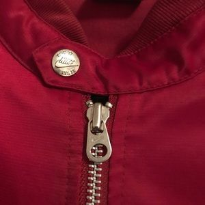 Tag says XL but it’s very right fitting. I wear a Men’s Large and it fits like a medium. Very light wear. Color is Deep/Crimson Red.