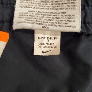 These Nike swim trunks combine style and practicality, featuring a comfortable drawstring waist and handy side pockets. The navy color is complemented by aqua stripes, offering a sleek look for aquatic activities. Made from durable polyester, these trunks are designed to withstand regular use and maintain their shape.