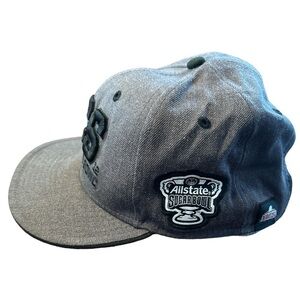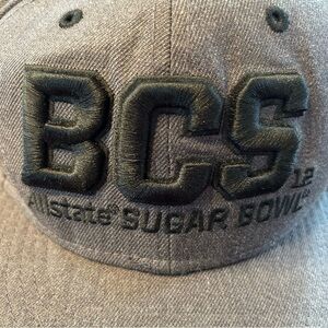 Nike True Snapback Flat Hat purchased at the 2012 BCS ALLSTATE SUGAR BOWL. Gray wool blend hat with plastic adjustable strap at back. BCS 12 ALLSTATE SUGAR BOWL embroidered spellout on front panel. Allstate Sugar Bowl embroidered patch/badge on one side. BCS logo tag on one side. Michigan block M embroidered in maize/yellow on other side. Nike swoosh logo embroidered on back panel. One size fits most. 85% acrylic/15% wool.