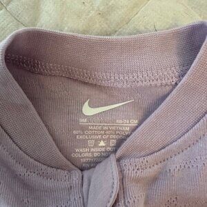 Adorable purple Nike bodysuit for baby girls or boys, size 9 months. Soft, breathable fabric with classic Nike logo. Perfect for playtime or everyday wear. Gently used and in great condition—no stains or damage and never used! Easy zipper for quick diaper changes.