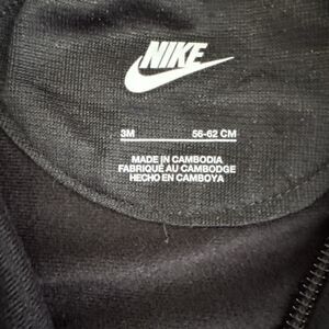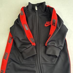 Nike onesie black and red Nike 3 Month track suit. Zips all the way down and open at the leg cuff for easy diaper changes. Red and black Nike logo stripes running down both sides and down the arms. How cute is this? Please see photos for details. I see no evidence this tracksuit has ever been worn.