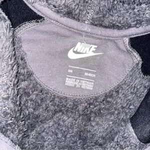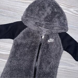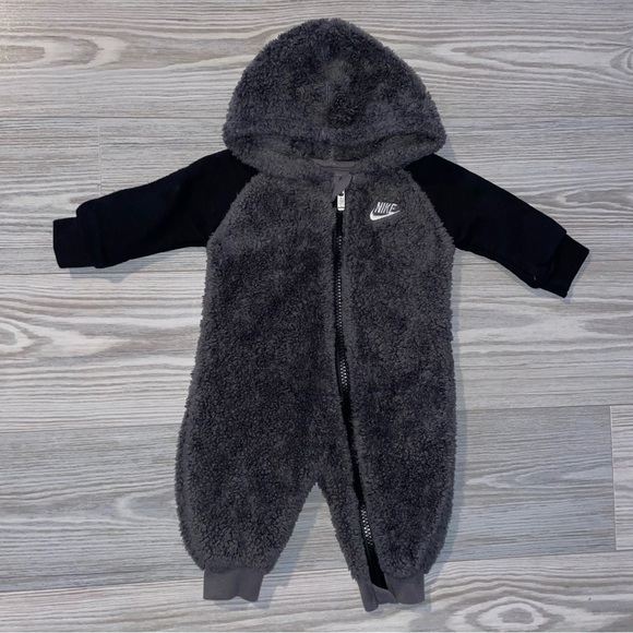 Baby boys one-piece fleece zip-up outfit by Nike, size 3 months. Long sleeves with hood and full-length pants. Soft fleece fabric for warmth and comfort. Easy zip closure for quick dressing and diaper changes.