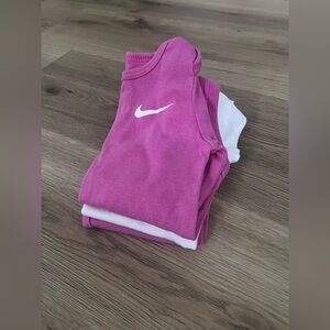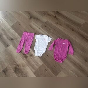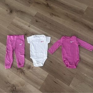 Adorable Nike set. Size 9 months. Includes a pink long-sleeve onesie, a white short-sleeve onesie and pink pants. Perfect to mix and match. Excellent condition.