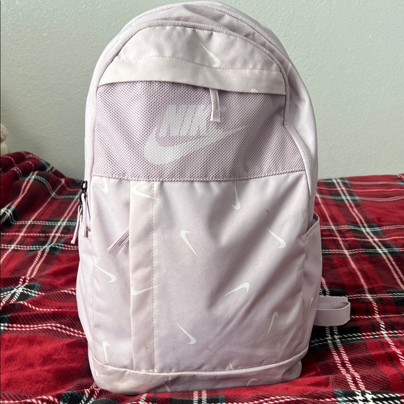 Compact Nike backpack in soft light pink. White Swoosh logos scatter the front. Mesh top pocket for quick access. Padded straps for comfortable wear. Great for daily carry.