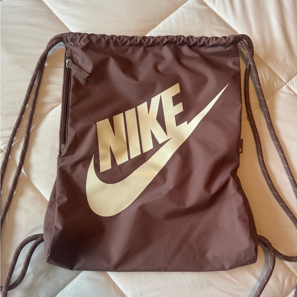 This Nike backpack in a rich brown hue combines style and practicality with its drawstring closure and durable synthetic material. Perfect for daily use, it offers a sleek design with the iconic Nike swoosh prominently displayed. Ideal for carrying essentials, this backpack is both functional and fashionable.