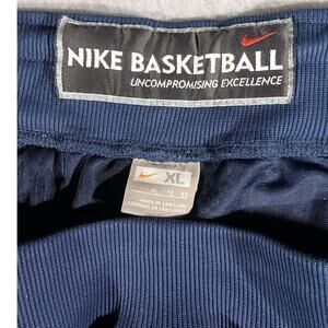 Classic vintage Nike Basketball shorts from the early 2000s, featuring dark navy blue mesh fabric with light blue and white satin trim and embroidered Nike swoosh logos. Made in Thailand, these shorts are tagged size XL and crafted from 100% polyester for breathable, lightweight comfort. A rare retro piece from Nike’s “Uncompromising Excellence” era — perfect for collectors or anyone into 2000s basketball style.