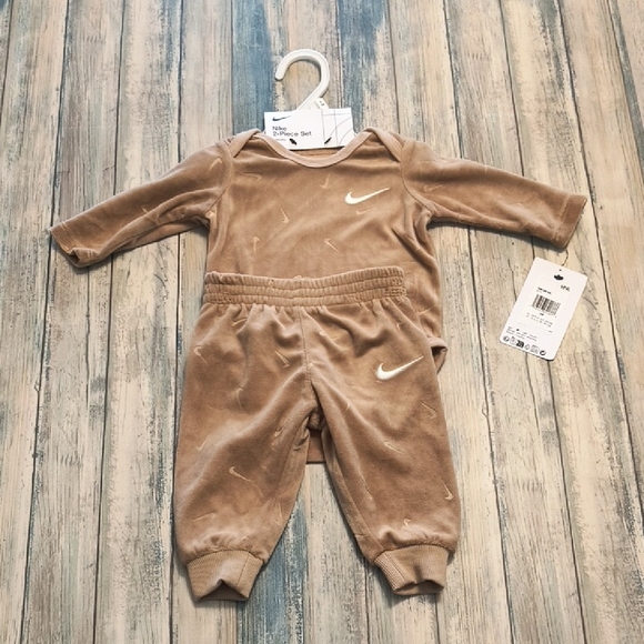 Charming Nike baby outfit in beige. Includes long-sleeve top and comfy pants. Ideal for everyday wear. Size 3 months.