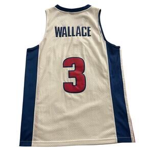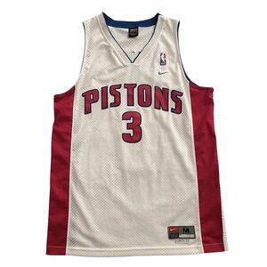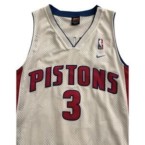 The product is a Nike Ben Wallace #3 Detroit Pistons men's NBA jersey in size M, featuring the colors red, white, and blue. This officially licensed jersey is perfect for fans of the National Basketball Association and the Detroit Pistons team. Made by Nike, a trusted brand in sports apparel, this jersey is a great way to show support for your favorite player and team on and off the court. Stitched Jersey.+++ Sold as pictured.