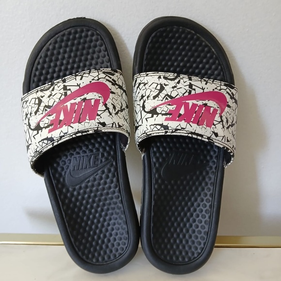 Black Nike slides with a textured rubber sole and a wide strap. The strap is white with a black cracked‑paint pattern and a pink Nike Swoosh logo. The inner sole has an embossed Nike Swoosh. The shoes are preloved and in good condition.