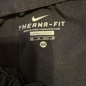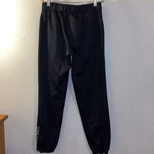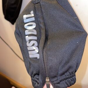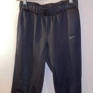 Comfortable black joggers by Nike. Features an elastic waistband and side pockets. Perfect for workouts or casual wear. Zips on back of legs with logo