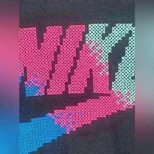 Logo embroidered in blue, pink, and green