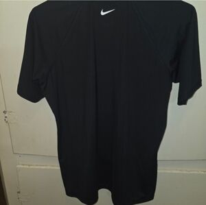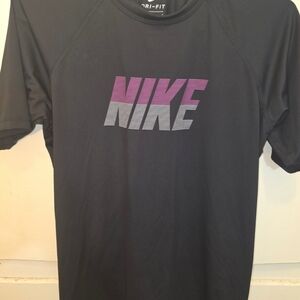 Get ready to work up a sweat or just lounge in style with this classic Nike t-shirt. This women's size large tee is made with Nike's signature Dri-FIT fabric, designed to wick away sweat and keep you dry and comfortable. It's a versatile black shirt with a striking "NIKE" logo across the chest in a cool pink and gray striped design. The shirt is in excellent pre-loved condition with no noticeable flaws. Perfect for running, hitting the gym, or everyday casual wear.