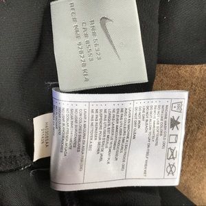 Nike Black Dri-Fit Capris Athletic Pants with white double stitching down front center each leg that curves to outer leg and around back of knee. Pants have draw string inside and a back center square 3.5" x 3.5" flap over pocket. Pants have 5 dots down left outside lower leg that may Glow in dark. There is only 1 on right leg. Measurements are taken laying flat across at the waist is 13", at hips is 16.5", and inseam is 19". See pictures for fabric and care. Medium ( 8-10 )