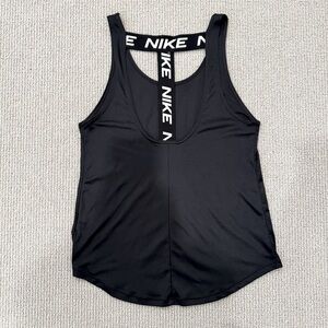 This Nike tank top showcases a sleek, fitted design in a classic black color, ideal for athletic pursuits. The sleeveless style ensures maximum freedom of movement, while the moisture-wicking fabric keeps you cool and dry. A subtle Nike swoosh logo adds a touch of brand authenticity.