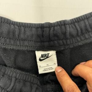 Nike fleece jogger-style sweatpants in black. Features the embroidered Nike swoosh logo on the front left thigh, drawstring waist, and elastic cuffs. Tagged size XL, made in India. Super soft and warm for everyday wear, gym, or lounging. Light general wear but in great pre-owned condition with no holes or stains.