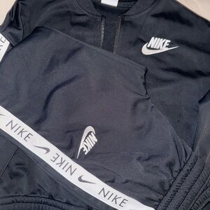 Sleek black jacket featuring white Nike logo. White stripe details on sleeves. Ideal for sporty style.