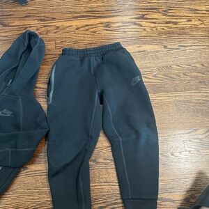 Stylish black hoodie and pants set. Features front zipper and pockets. Comfortable and durable.