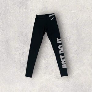 Nike's black leggings offer a sleek and stylish look, perfect for any workout. Made from a stretchy athletic material, these form-fitting leggings ensure comfort and flexibility. The iconic Nike branding and swoosh logo add a touch of sporty elegance, making them a must-have for your activewear collection.