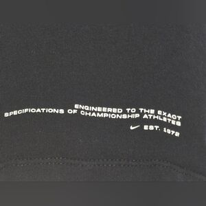 Clean and bold. This black Nike tee features an outlined NIKE graphic across the chest with a mini red logo hit. On the back hemline, a detailed stamp reads Engineered to the Exact Specifications of Championship Athletes – EST. 1972. Soft and comfortable, perfect for everyday wear or workouts.