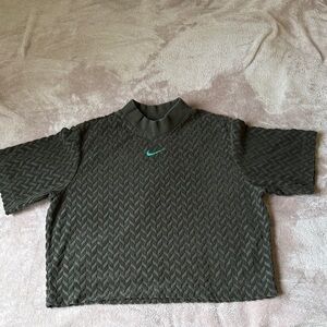 Black tee with a textured pattern. Features a teal Nike swoosh. Short sleeves and high collar.