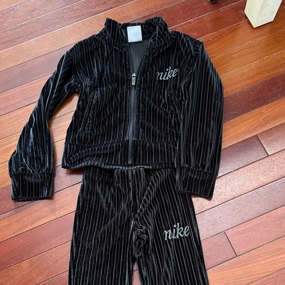 Chic black velour set with subtle stripes. Includes zip-up jacket and pants. Embroidered Nike logo.
