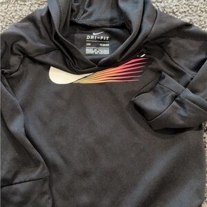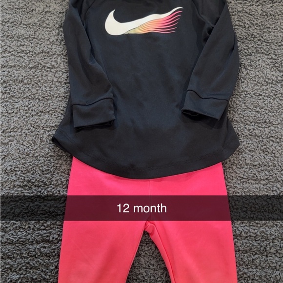 Black long-sleeve top with iconic logo. Paired with vibrant pink leggings.