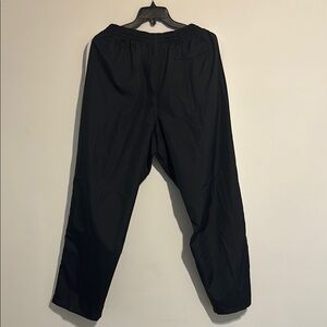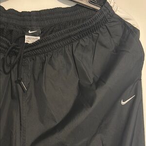 Nike track pants in black with white side stripes. Comfortable and stylish for sports or casual wear.