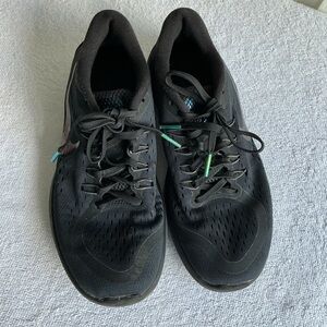Sleek black design with a vibrant blue swoosh. Comfortable and stylish for everyday wear.