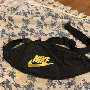 Stylish Nike waist bag in black with a bold gold logo. Perfect for carrying essentials.