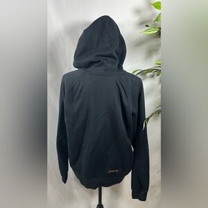Stylish black sweater with gold accents. Features a zip-up front. Comfortable and warm.