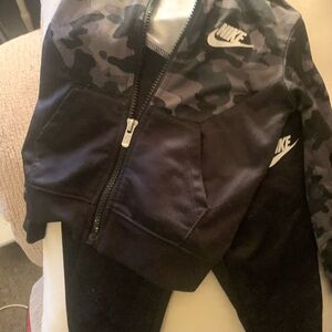 Nike tracksuit with black and gray camo pattern. Features zip-up jacket and matching pants. Sleek and modern design.