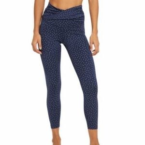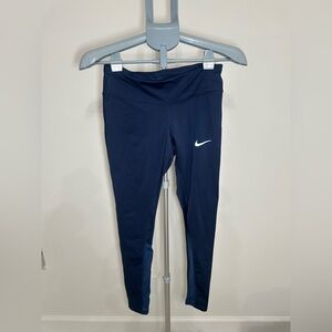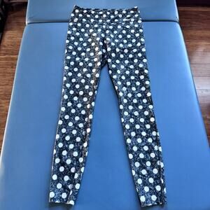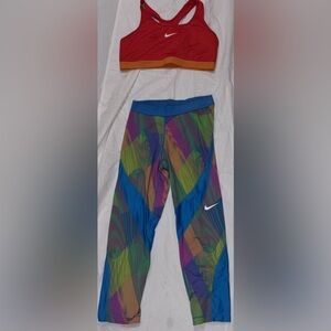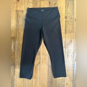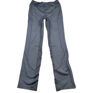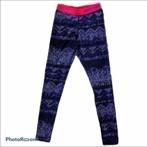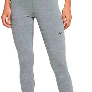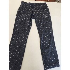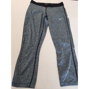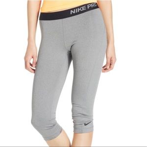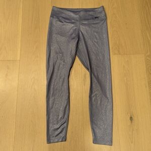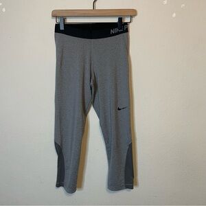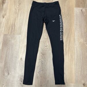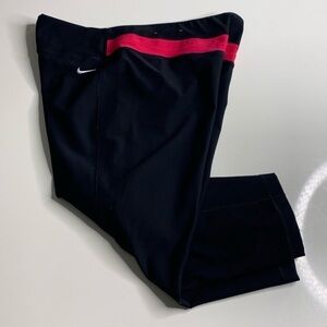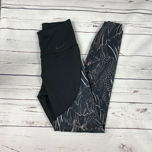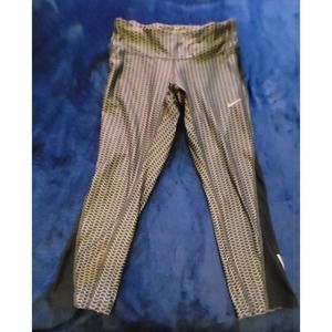 Stylish black leggings with silver and gold stripe accents and a gray waistband. Perfect for workouts. Nike Pro series.