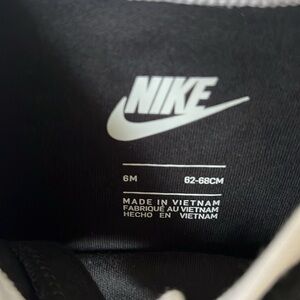 This Nike one piece combines sleek black fabric with vibrant green accents, featuring the iconic swoosh logo. Designed with long sleeves and covered feet, it ensures comfort and warmth. The easy snap or zipper closures make it a practical choice for everyday wear.