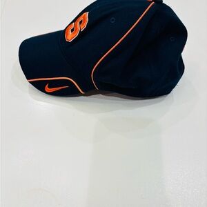 Stylish black cap with orange piping. Features Nike logo and number embroidery.