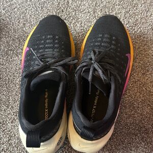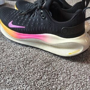 Stylish Nike athletic shoes. Black upper with pink accents. Comfortable and durable.