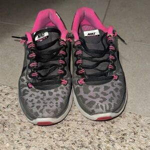 Reflective cheetah Experience the perfect blend of style and performance with these Nike athletic shoes. Featuring a striking black and pink color scheme, these shoes boast a unique animal print design for a bold look. With comfortable padding and a supportive low-top design, they're ideal for any athletic activity.