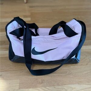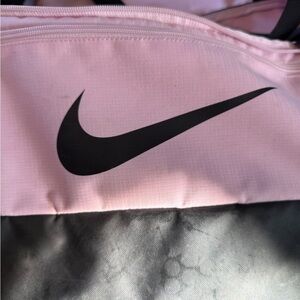 Stylish duffel bag with a pink body and black accents. Features the iconic Nike logo. Perfect for gym or travel.